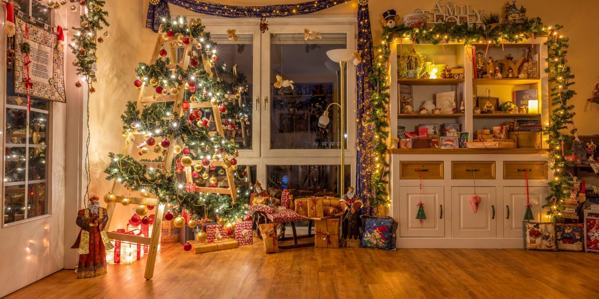 Этот прием мгновенно преобразит кухню или комнату. Привяжите к небольшим веночкам (из еловых веток, фетра или готовым декоративным) или даже к отдельным елочным игрушкам и снежинкам нарядные ленточки. Затем просто закрепите эти ленты с внутренней стороны дверок шкафов. Просто, быстро и невероятно уютно.