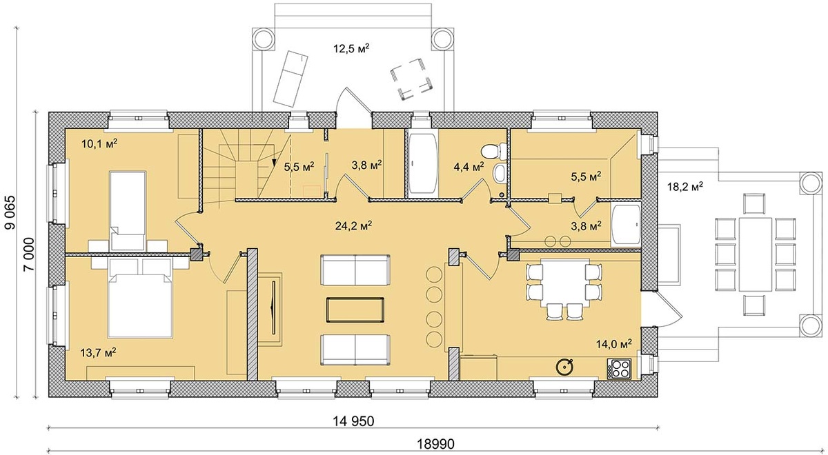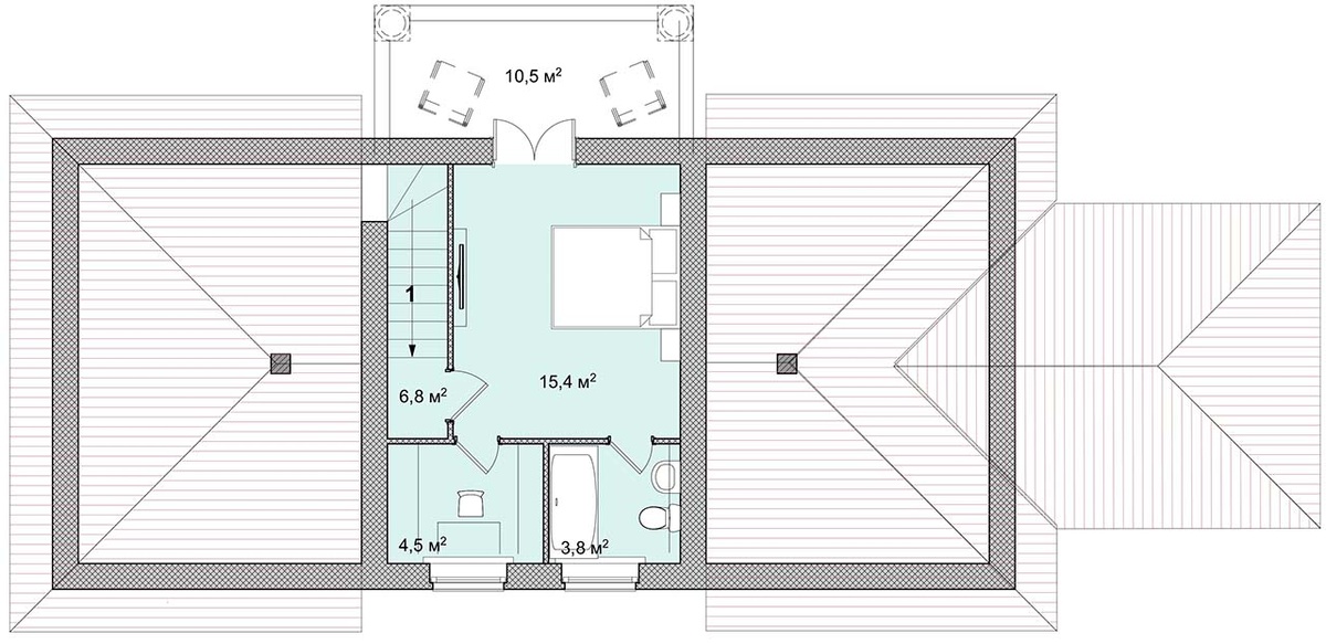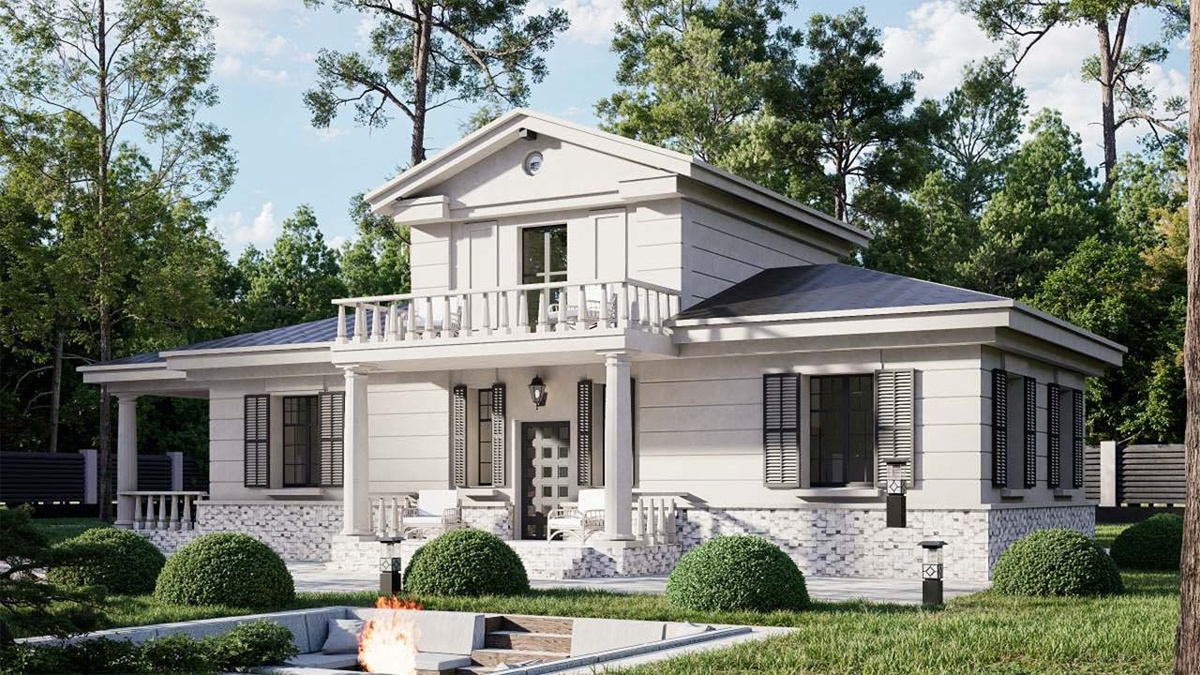 Второй тип — более просторный загородный дом, часто включающий две террасы и большую лоджию. Первый этаж отводится под общие зоны и две спальни, а мезонин превращается в уединённый апартамент. Архитектурный облик таких домов выдержан в лаконичной классике, что упрощает процесс строительства.