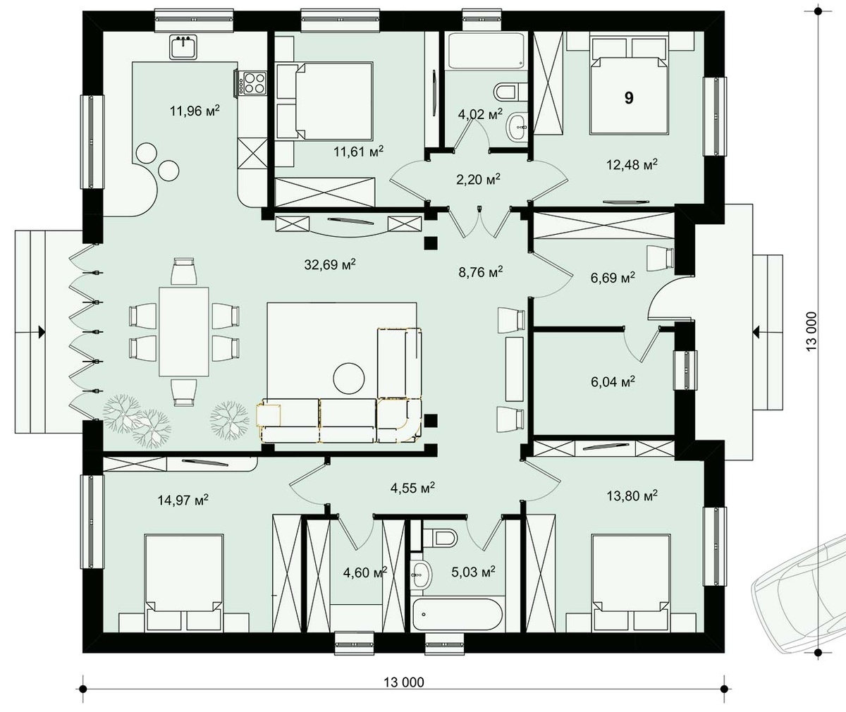 Это направление представляет собой воплощение принципов рациональности и функциональности. Простая квадратная или близкая к ней форма коробки минимизирует сложность и стоимость строительных работ, а также сокращает площадь наружных стен, что положительно сказывается на энергосбережении. В основе планировки лежит всё то же трёхчастное деление, обеспечивающее чёткое разделение на общие и приватные зоны.