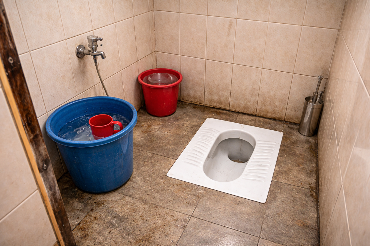 Вода здесь является абсолютным культурным и ритуальным стандартом чистоты. Практически всё население использует воду, а туалетная бумага не распространена. Для гигиены интимной зоны может применяться мыло по желанию, в то время как мытьё рук с мылом является обязательным. Стандартное оснащение включает сосуд (лоту) с водой или гигиенический душ (биде-душ), закреплённый рядом с унитазом.