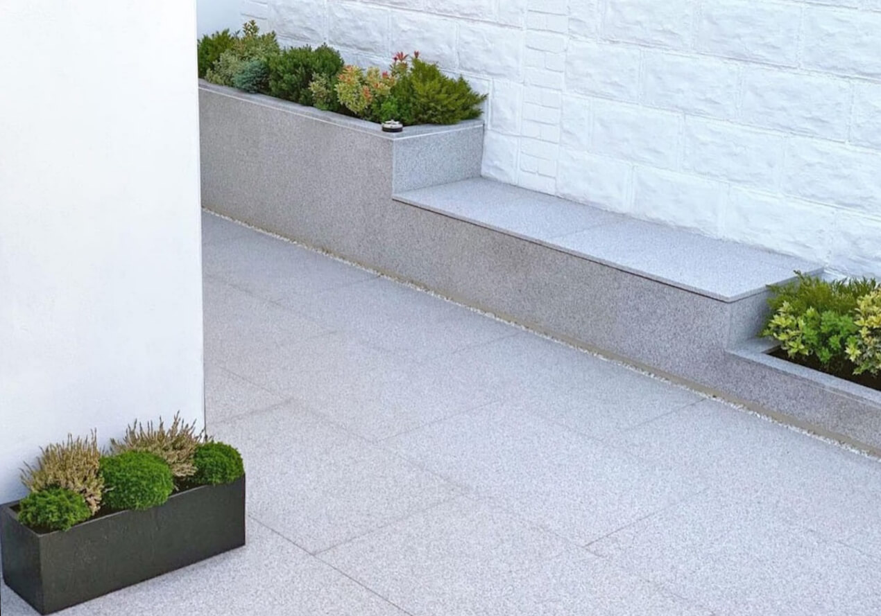 Термообработанный гранит приобретает исключительные противоскользящие свойства, что делает его материалом номер один для мощения уличных тротуаров, ступеней, площадок у бассейнов и других зон, где безопасность — приоритет. Этот вид обработки идеально вписывается в концепции ландшафтного дизайна в стиле кантри, рустик или средиземноморском провансе.