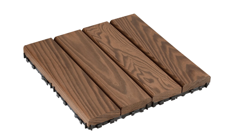 Идеальный вариант для тех, кто скептически относится к полностью синтетическим покрытиям. Внешний слой такой плитки выполнен из термообработанной древесины (чаще всего ясеня), что повышает ее устойчивость к влаге и гниению. Основание же, как правило, изготавливается из полиэтилена низкого давления (ПНД). Стандартный размер плитки — 30х30 см. Стоимость набора из 6 плиток (площадью 0.54 м²) начинается от 2500 рублей. Комбинируя плитки, можно получить дорожку шириной 30 см (одна плитка) или 60 см (две плитки в ширину).