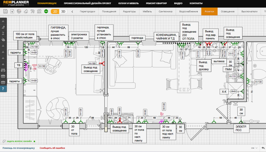Сильная сторона RemPlanner — проектная приземленность: планы помещений, раскладка, логика электрики (группы, выключатели, сценарии), точки света, привязки, понятные прорабам и мастерам. Это не фотореализм, а предотвращение классических конфликтов: мебель не перекрывает щиток, подсветка не бьет в глаза, вывод воды совпадает с тумбой, а проходы соответствуют эргономике.