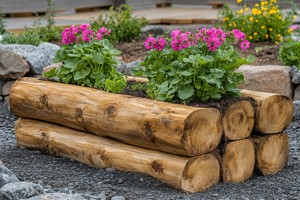 Отличный способ использовать спиленные деревья. Короткие чурбаки длиной 25-30 см вкапываются вертикально и вплотную друг к другу по контуру грядки. Такое ограждение выглядит естественно и органично вписывается в природный ландшафт, а его стоимость стремится к нулю.