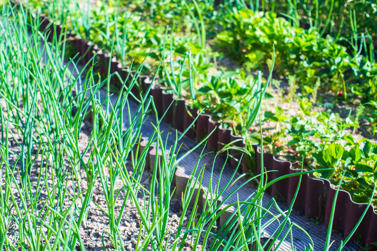 Обрезки металлического профнастила или винилового сайдинга, оставшиеся после строительства, — готовый материал для бортиков. Полосы вкапываются в землю на 10-15 см, создавая чёткий и очень долговечный контур для грядки без дополнительных вложений.