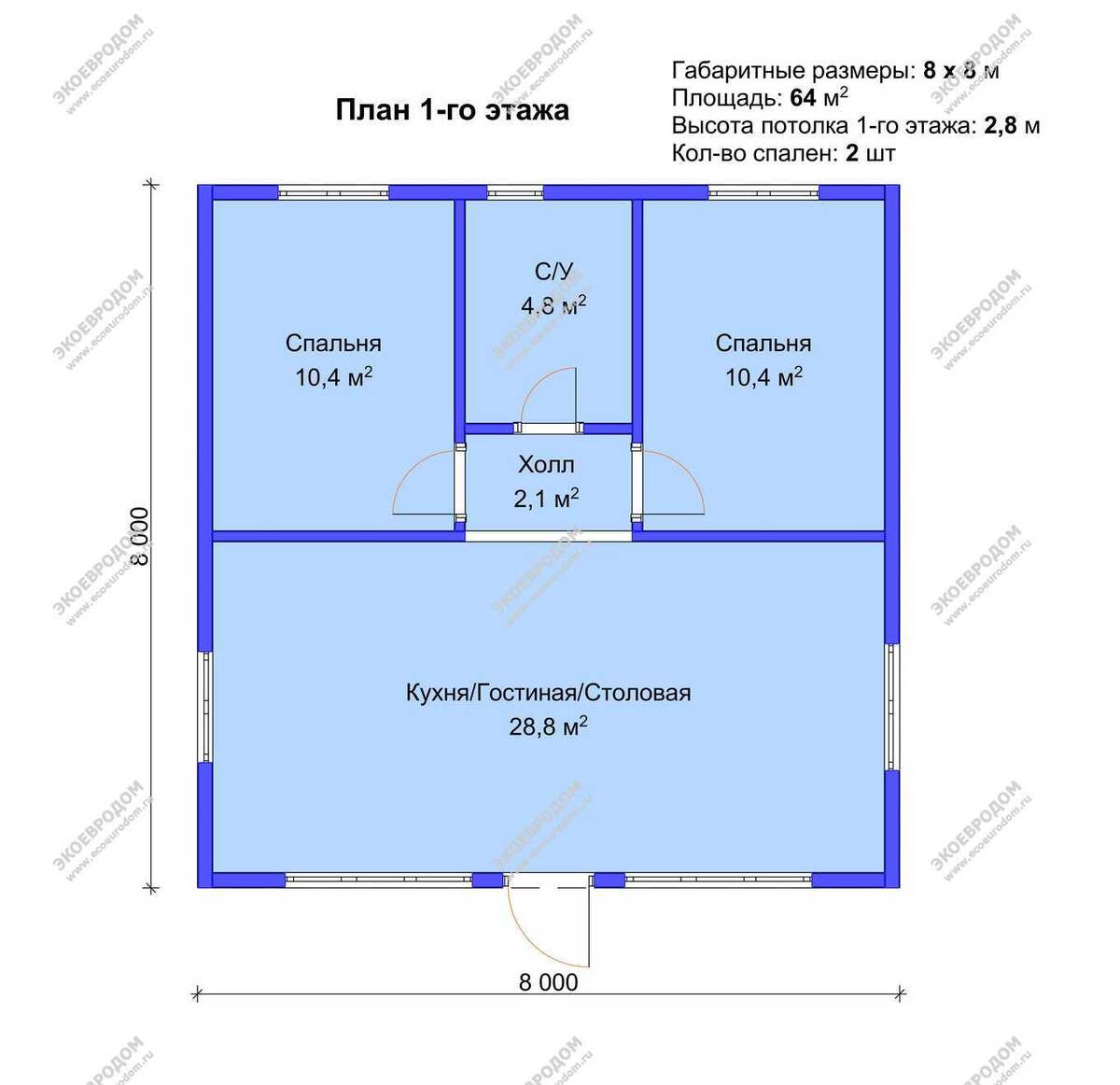 Одноэтажная планировка дома 8х8 метров обладает своими неоспоримыми преимуществами. Это не только потенциально более низкая стоимость строительства, но и повышенная безопасность и удобство для пожилых людей или семей с маленькими детьми, так как полностью отсутствуют лестницы. Проект «Новопоселки» площадью 64 кв.м предлагает компактное и функциональное зонирование: совмещённая кухня-гостиная, спальня и санузел. Это отличное решение для небольшой семьи или для использования в качестве дачного дома, сохраняющее все плюсы квадратной формы.