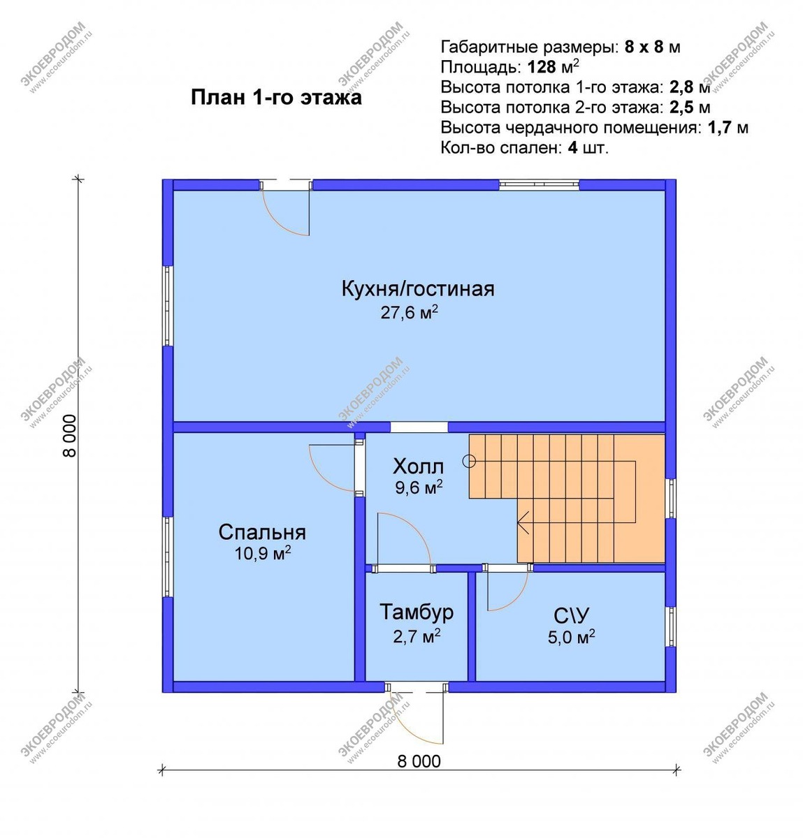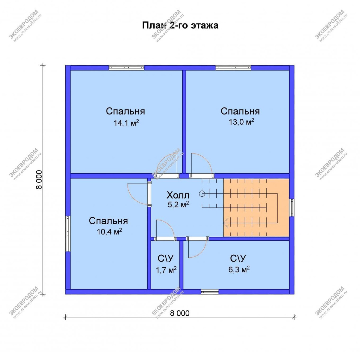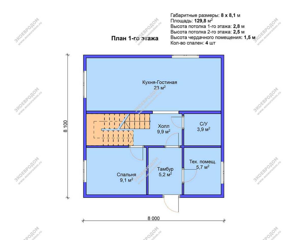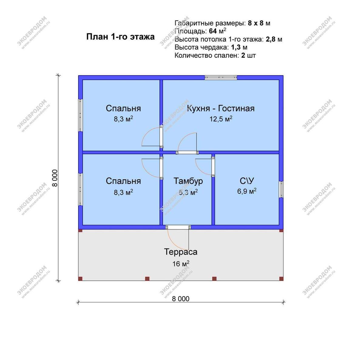 Квадратные дома размером 8 на 8 метров лучше всего подходят для участков площадью от 6 до 10 соток. Проект "Мещерино"