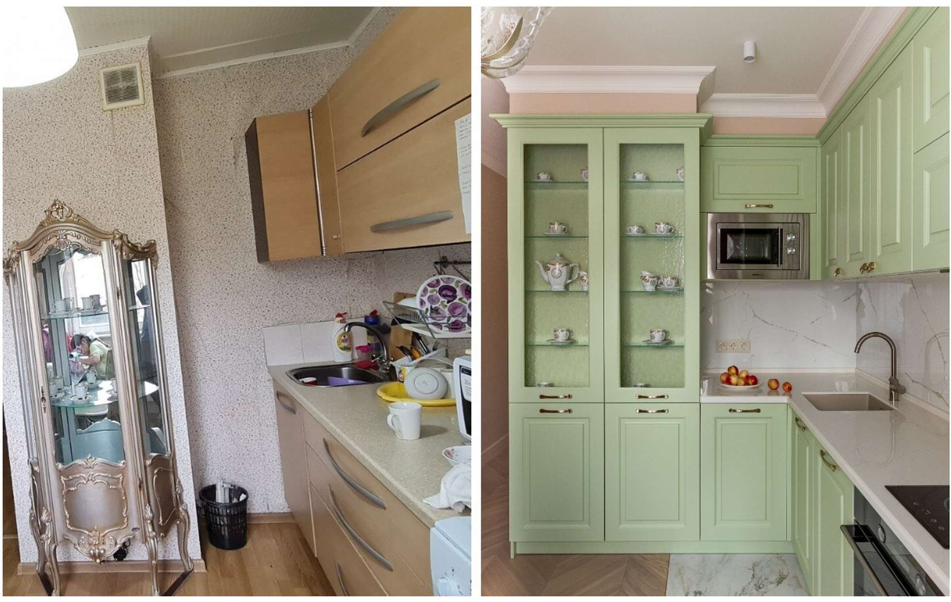 На фото представлен впечатляющий результат реконструкции — кухня до и после ремонта.