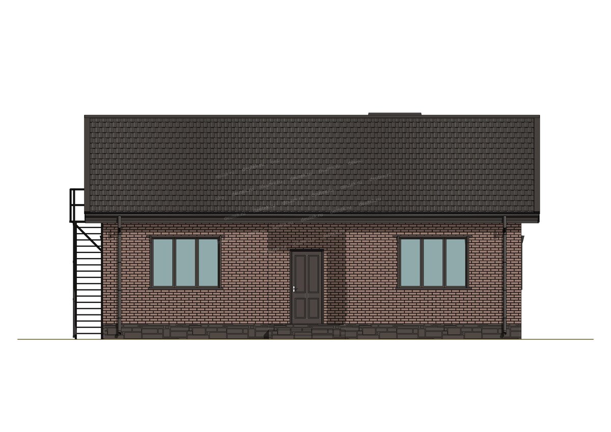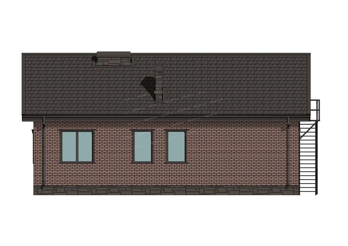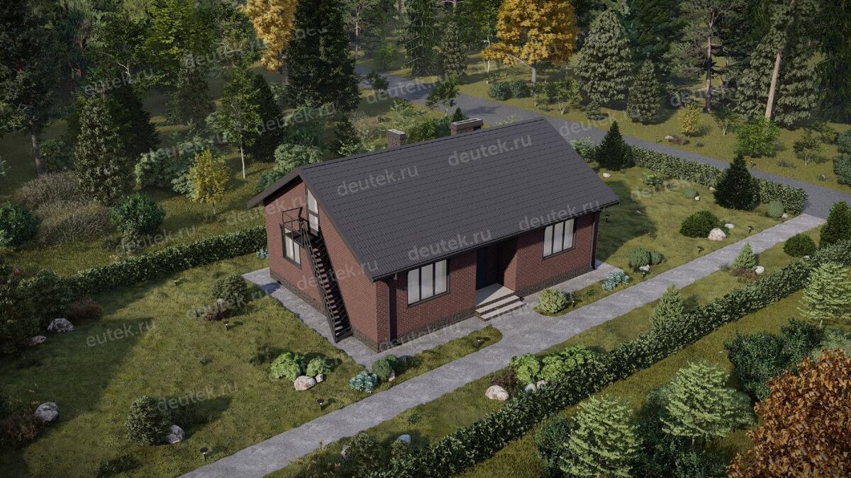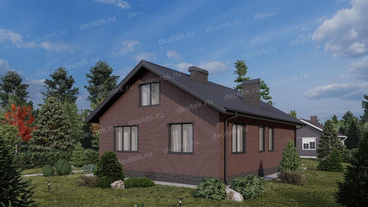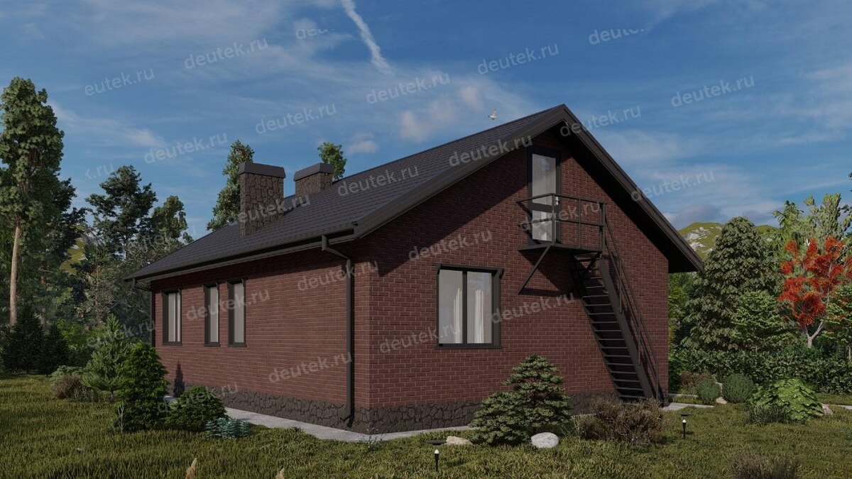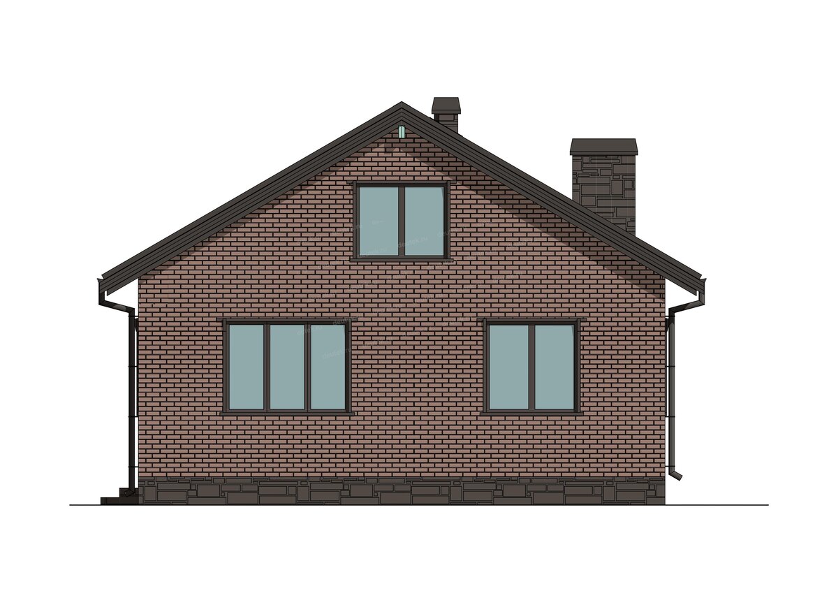 Крыша у дома двухскатная, чердачного типа, что дает дополнительное пространство для хранения или потенциального обустройства. В качестве кровельного покрытия используется клинкерная плитка, а цокольная часть отделана декоративным камнем. Основной фасад выполнен с применением штукатурки, что позволяет играть с цветовыми решениями. Визуально дом выглядит современно и солидно, а высокая лестница на чердак добавляет ему индивидуальности.