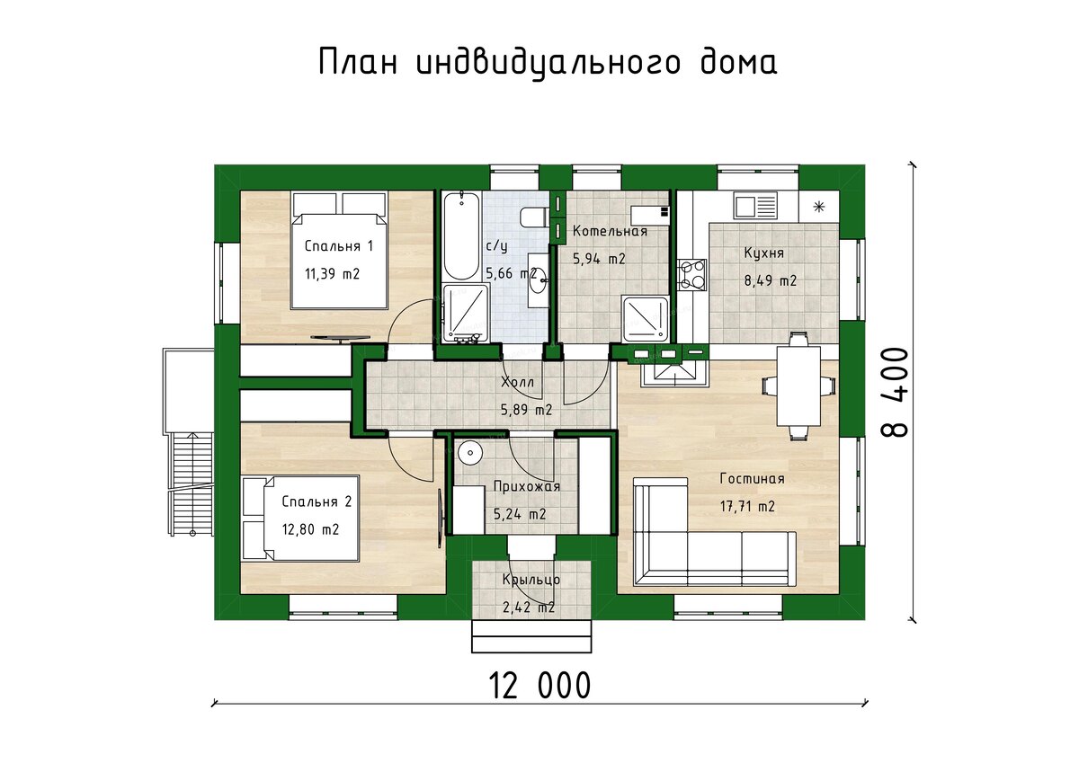 Входная группа начинается с крыльца, ведущего в прихожую площадью 5.2 м², где удобно организовать гардеробную зону. Далее план раскрывается следующим образом: