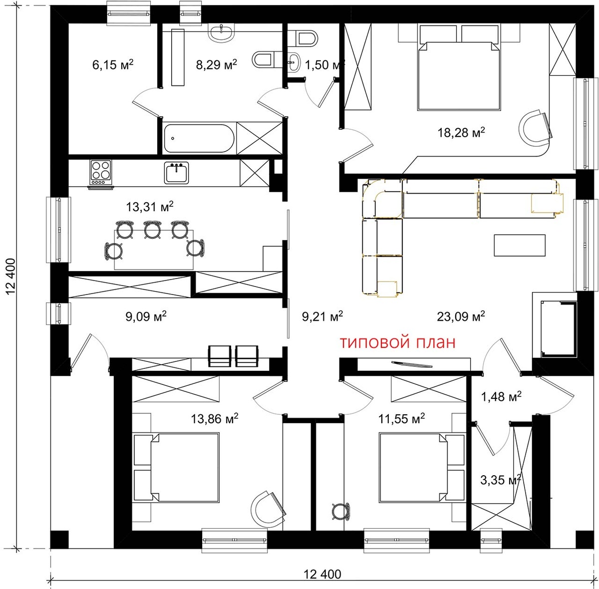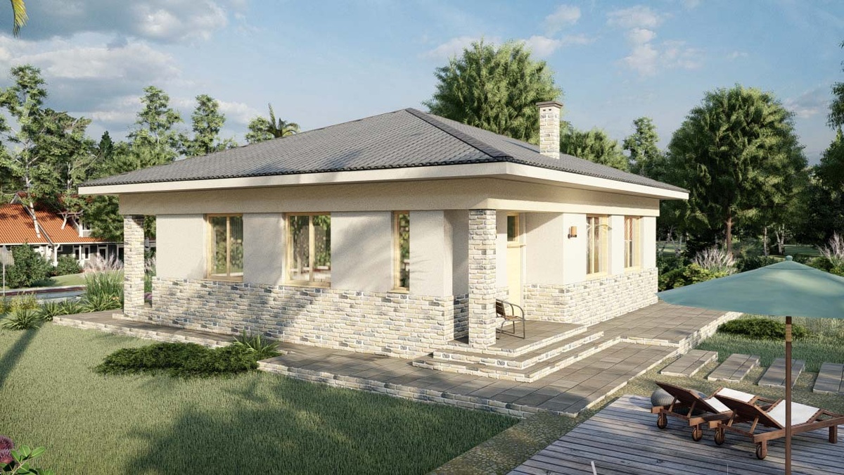 Квадратный одноэтажный дом, предлагающий свободную планировку. Простота архитектурной формы позволяет варьировать внутреннюю организацию пространства под конкретные нужды жильцов, создавая различные варианты зонирования.