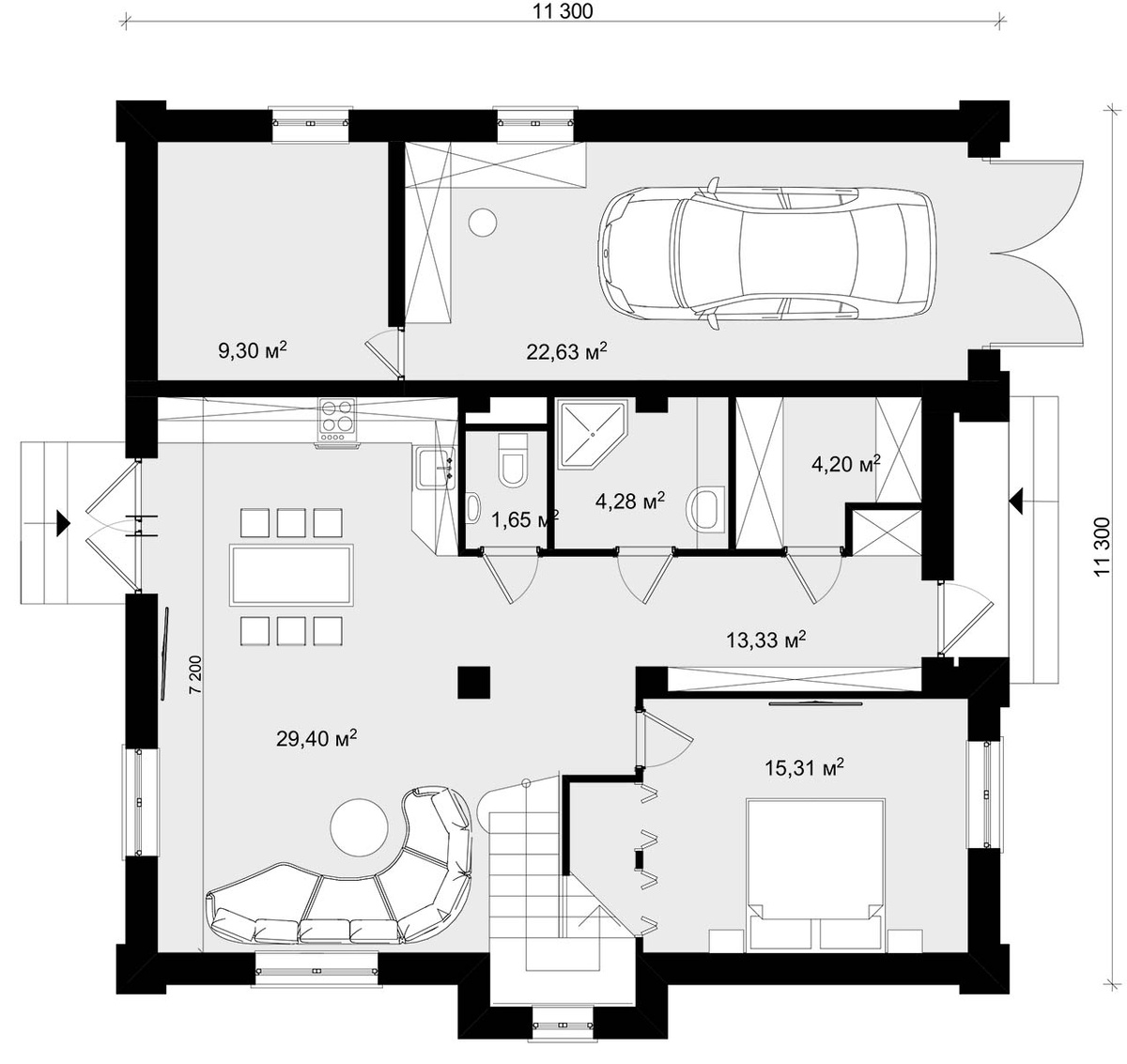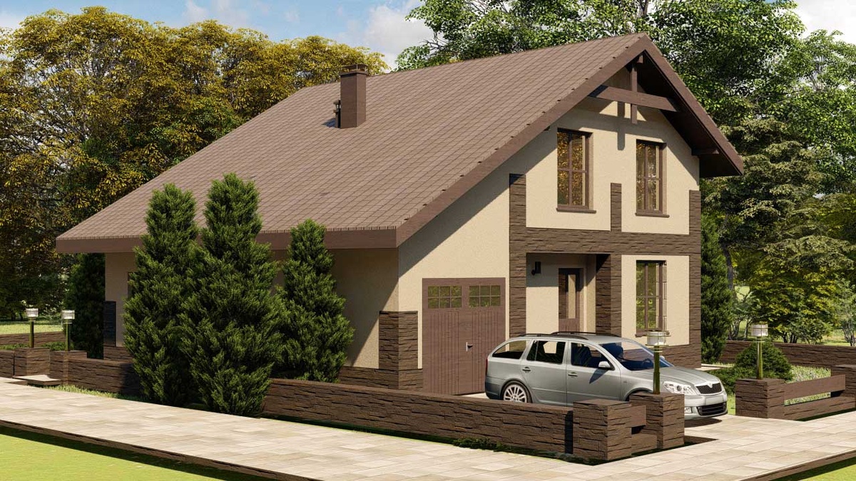 Пятикомнатный двухэтажный дом с интегрированным гаражом. На первом этаже, помимо жилых и хозяйственных помещений, размещён гараж и большая кладовая. Мансардный этаж вмещает до четырёх спален и отдельный санузел. Проект отличается рациональным использованием площади при размерах 11х11 метров.