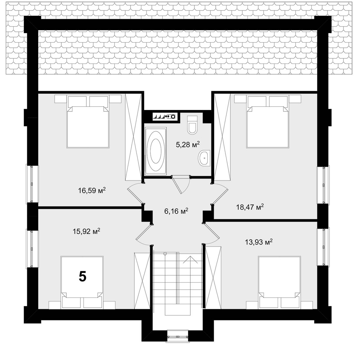 Небольшой пятикомнатный дом в стилистике, отсылающей к шале. При схожей с предыдущим проектом концепции, он имеет большую ширину, что делает внутреннее пространство более свободным. На мансарде возможна организация четырёх спален или трёх спален со вторым светом. Суровый и гармоничный внешний вид часто находит отклик у мужской аудитории заказчиков.