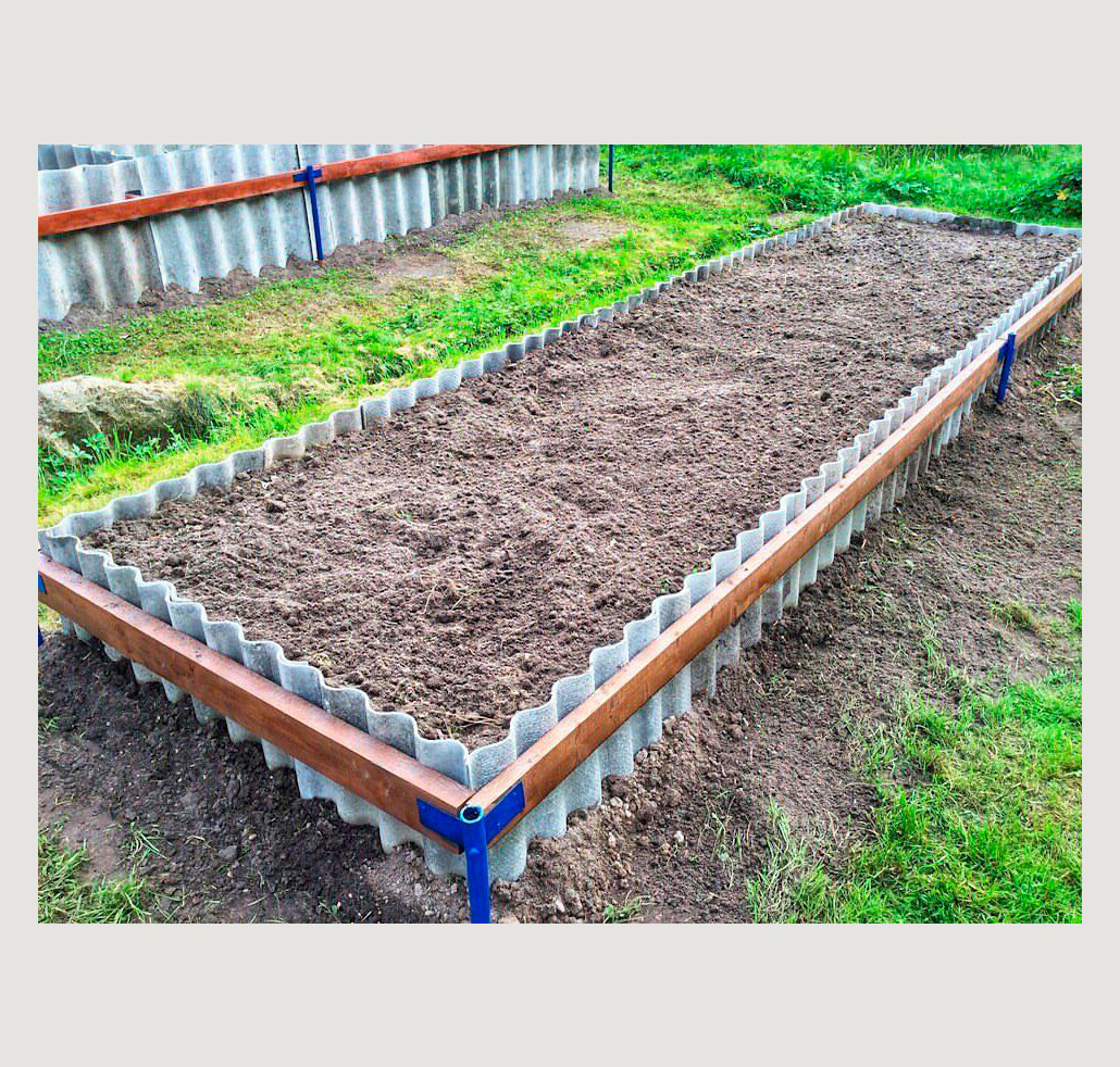 Прочный, хорошо держит грунт. Но волнистый шифер неудобен для ровной разметки, а старый может крошиться. Под вопросом безопасность старого асбестоцементного шифера — многие предпочитают не использовать его рядом с овощами.